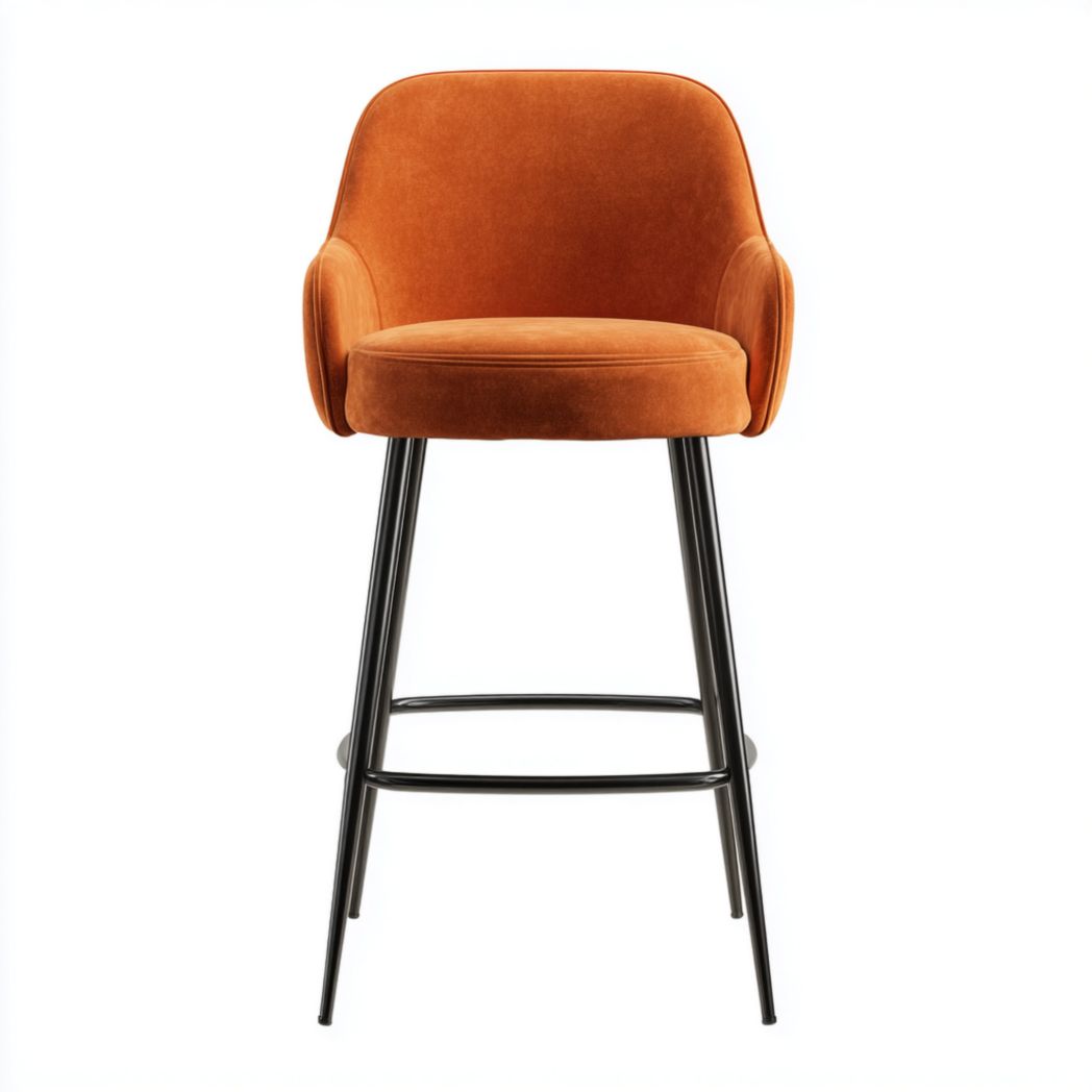 Chaise de bar avec assise rembourrée en tissu orange et pieds en métal noir