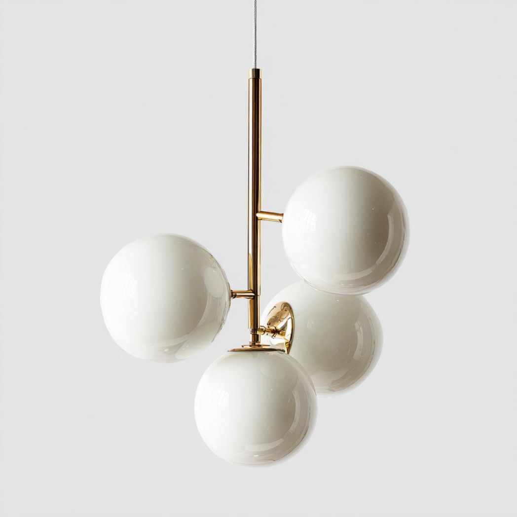 Plafonnier avec 4 boules en verre blanc et structure dorée